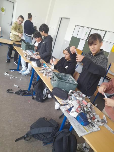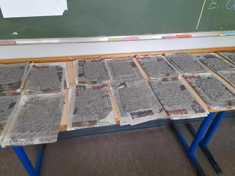 Die Klasse stellte gemeinsam aus altem Zeitungspapier neues Papier her und lernte dabei viel Wissenswertes aus dem Bereich Recycling.